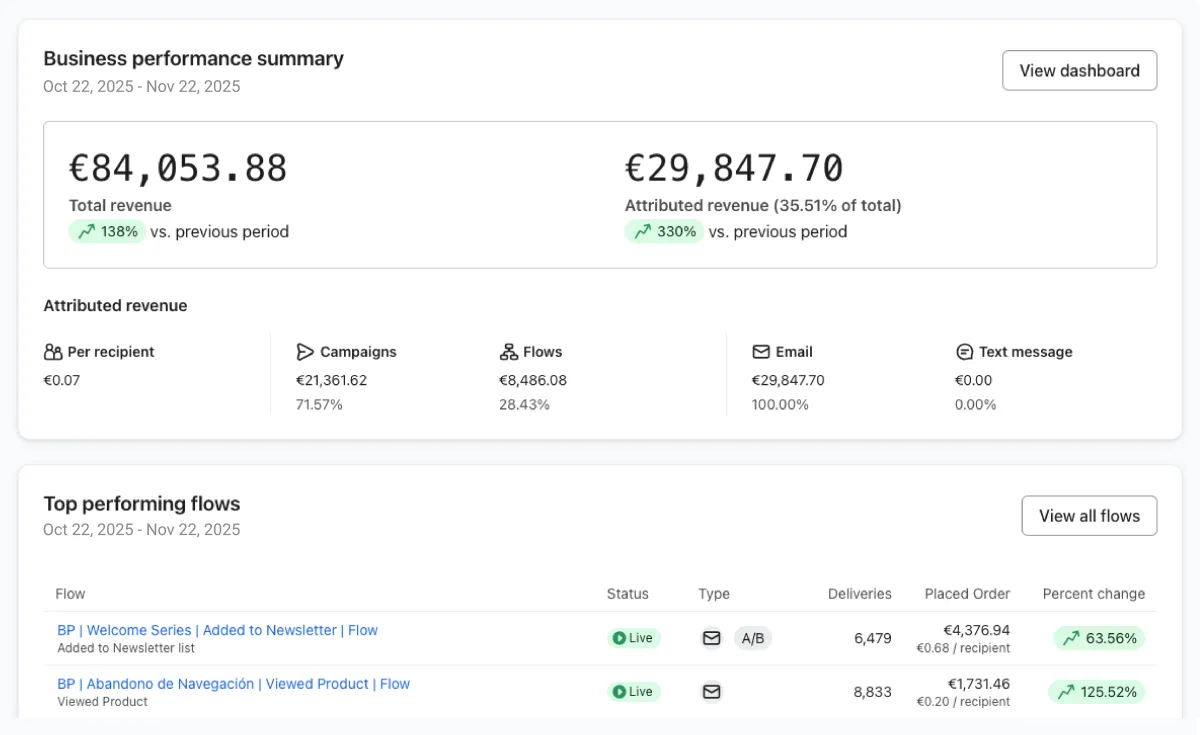 Análisis de flows claves (carrito, browse, post-purchase, VIP, welcome…).